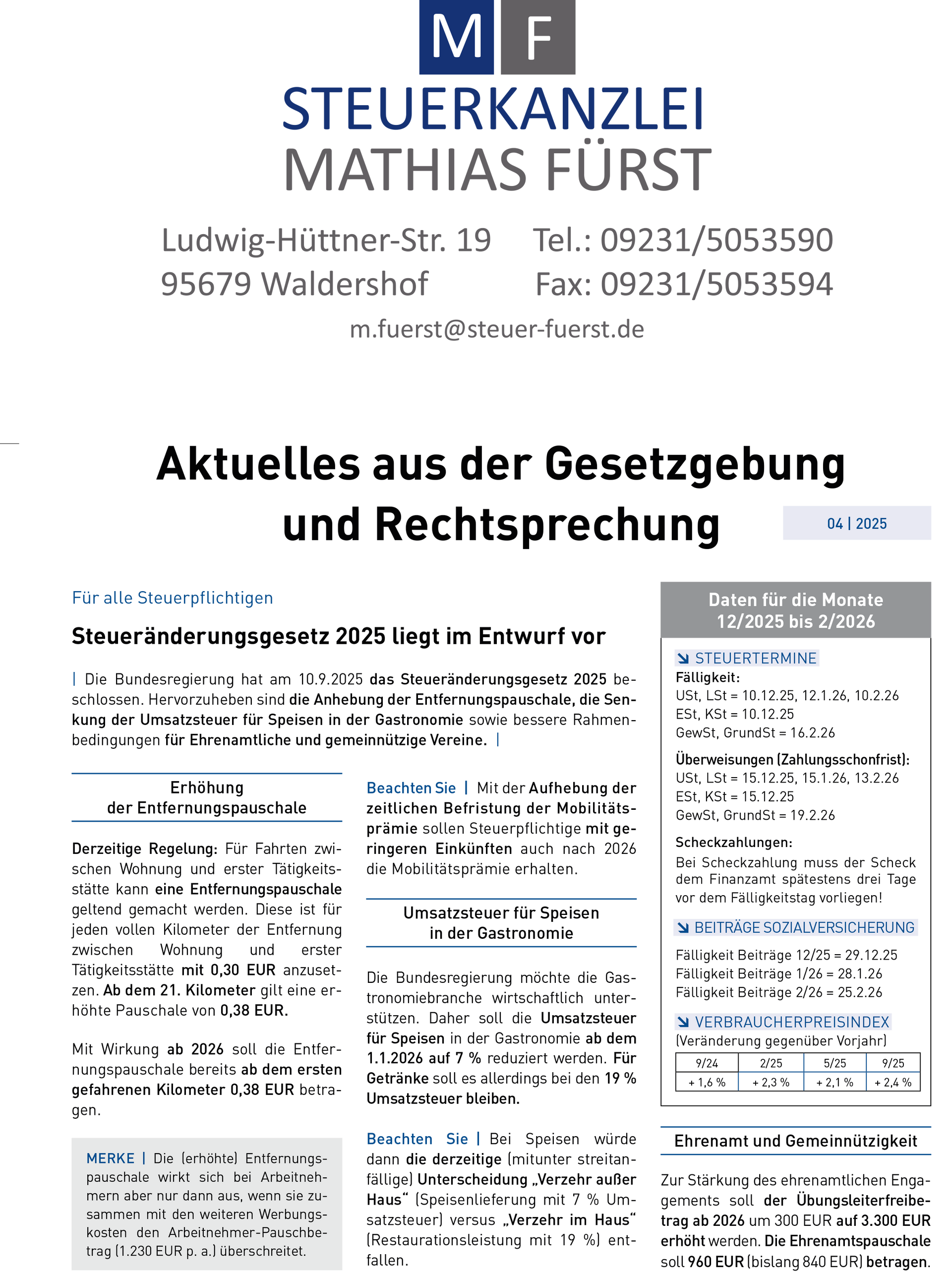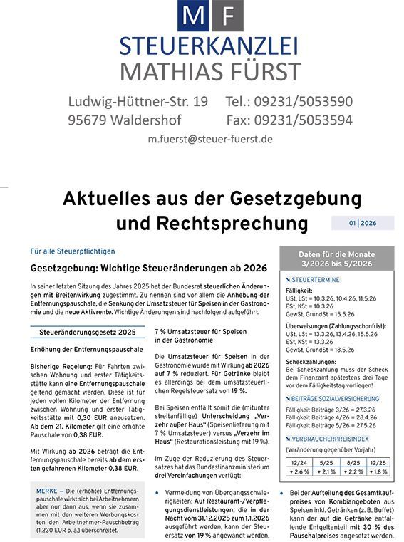 Kanzlei-News und Mandantenrundschreiben von Ihrer Steuerkanzlei in Waldershof